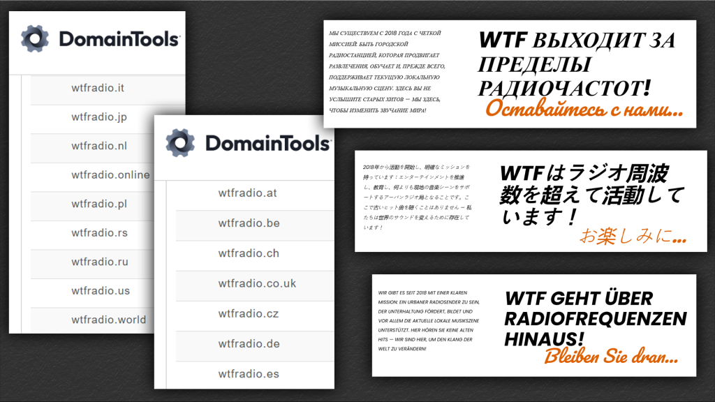 Platforma „DomainTools” pokazuje da se WTF radio nalazi na istom namenskom serveru kao još 13 WTF radio-sajtova sa različitim nacionalnim domenima, uključujući Austriju, Belgiju, Švajcarsku, Ujedinjeno Kraljevstvo, Češku, Nemačku, Španiju, Italiju, Japan, Holandiju, Poljsku, Rusiju i Sjedinjene Američke Države. Pored toga, sajt postoji i na još dva generička domena, „.online” i „.world”.