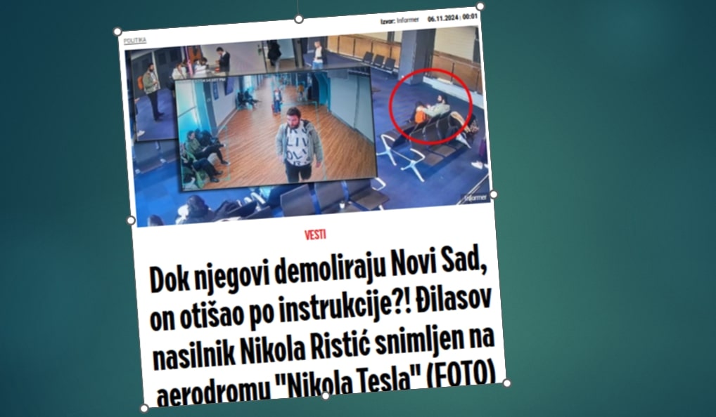 U tekstu je, međutim, tabloid objavio tri Ristićeve fotografije očigledno „skinute” sa bezbednosnih kamera beogradskog aerodroma. Na njima se Ristić vidi kako sedi na izlazu, kako se ukrcava u avion i šeta hodnikom. U tekstu iznose detalje o Ristićevom kretanju na aerodromu – u koje vreme je prošao „bording”, kada mu je bio let, kojom avio kompanijom je otputovao i u koju zemlju.