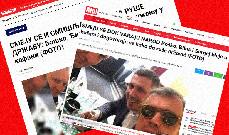 „SMEJU SE I SMIŠLJAJU KAKO DA RUŠE DRŽAVU: Boško, Đilas i Sergej na druženju u kafani (FOTO)“, glasi naslov teksta Večernjih novosti.