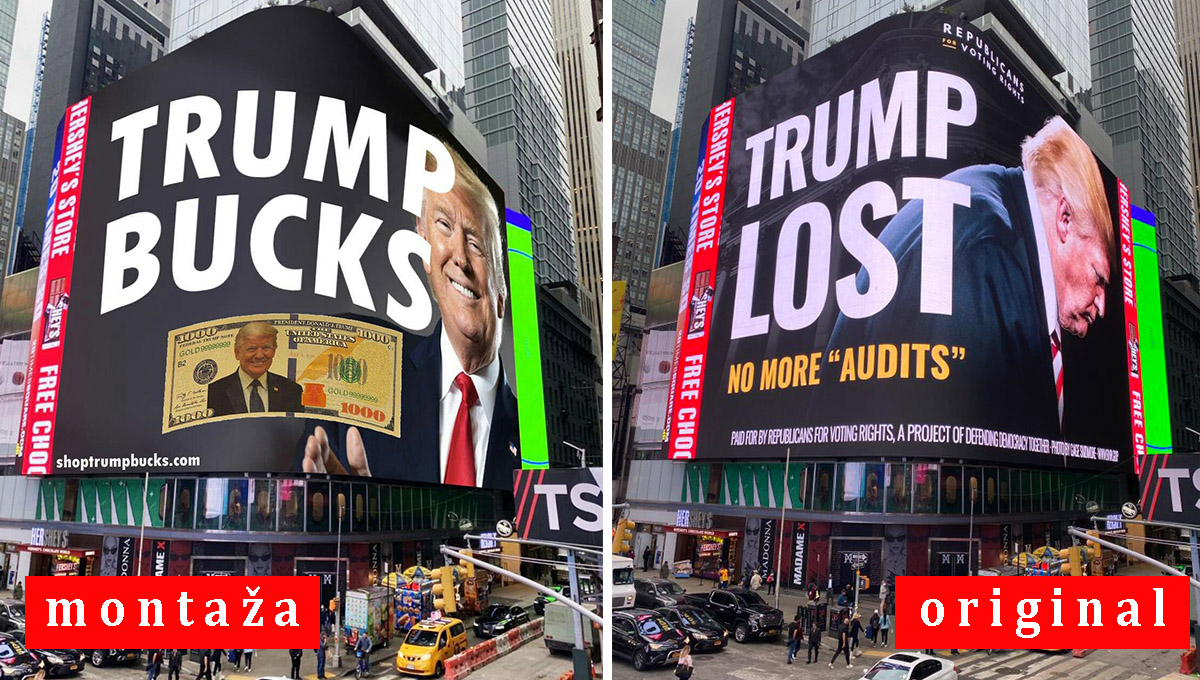 Fotografija je montirana, što se može videti i golim okom, ali smo i pretragom interneta utvrdili da je nastala u oktobru prošle godine i da na reklami nije pisalo „Trampovi dolari“ („Trump bucks“) već „Tramp je izgubio – nema više revizija“ („Trump lost – no more audits“). U pitanju je reklamna kampanja koju je prošle godine pokrenula grupa republikanaca protiv Trampa, okupljenih u organizaciji Republikanski projekat odgovornosti („Republican Acountability Project“).