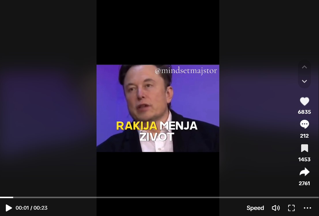 Osim ovog videa, postali su viralni još neki koji potiču sa istog mesta – plasirani su tokom prošle nedelje na TikTok nalogu „Nijesedesilo“ (korisničko ime „mindsetmajstor“). U jednom od snimaka sa ovog kanala, Ilon Mask „priznaje“ da je iz Republike Srpske, a u drugom govori o tome kako rakija menja život i kako je zamenio Teslu za Golfa dvojku. Ovaj snimak je dospeo i na Tviter, a u svim tim verzijama jedino što se razlikuje je tekst – u pitanju je potpuno isti insert iz istog Maskovog gostovanja.