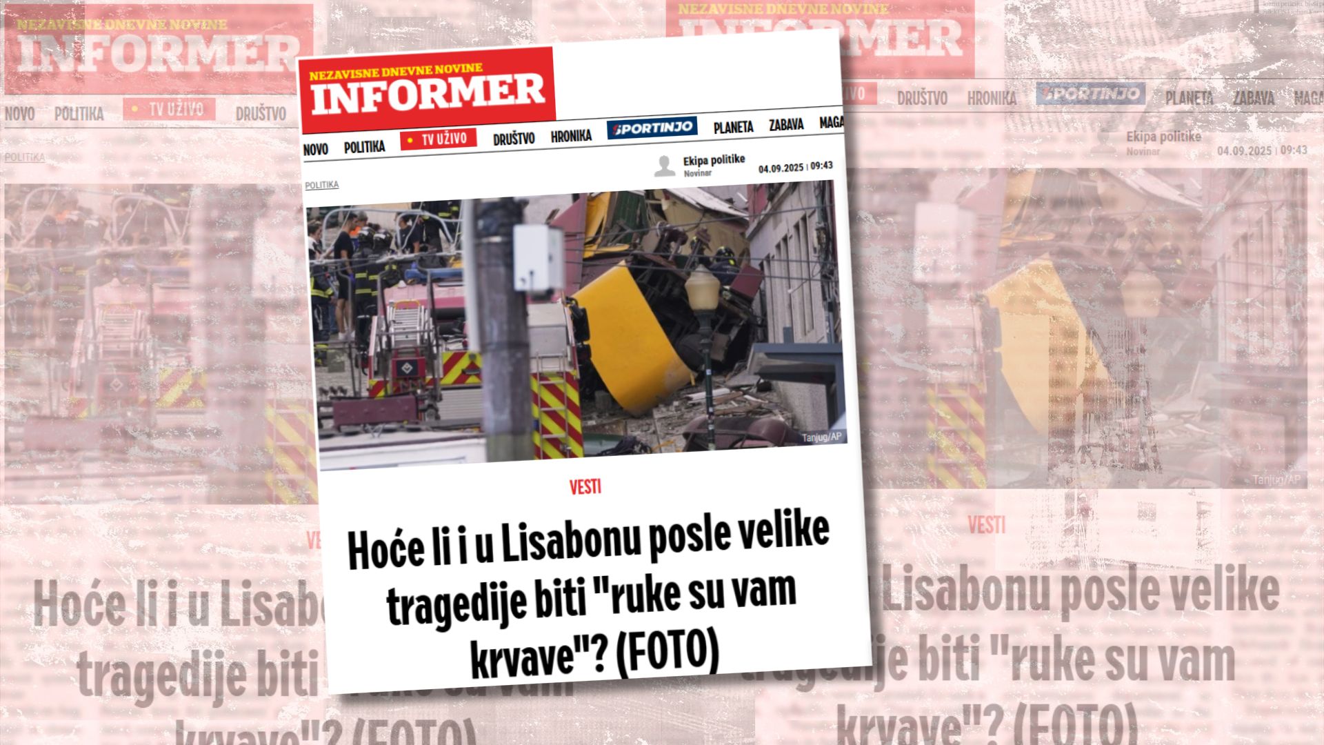 „Nakon nezapamćene tragedije koja se u sredu dogodila u Lisabonu, kada se otkačila žičara pri čemu je poginulo 15 osoba, postavlja se pitanje da li sada i u tom gradu biti krvavih ruku”, piše Informer. U tekstu postavlja i dodatna pitanja:„da li će biti masovnih protesta u tom gradu, blokada, napada na političke protivnike i njihove porodice, kao i uništavanja obrazovanja?”