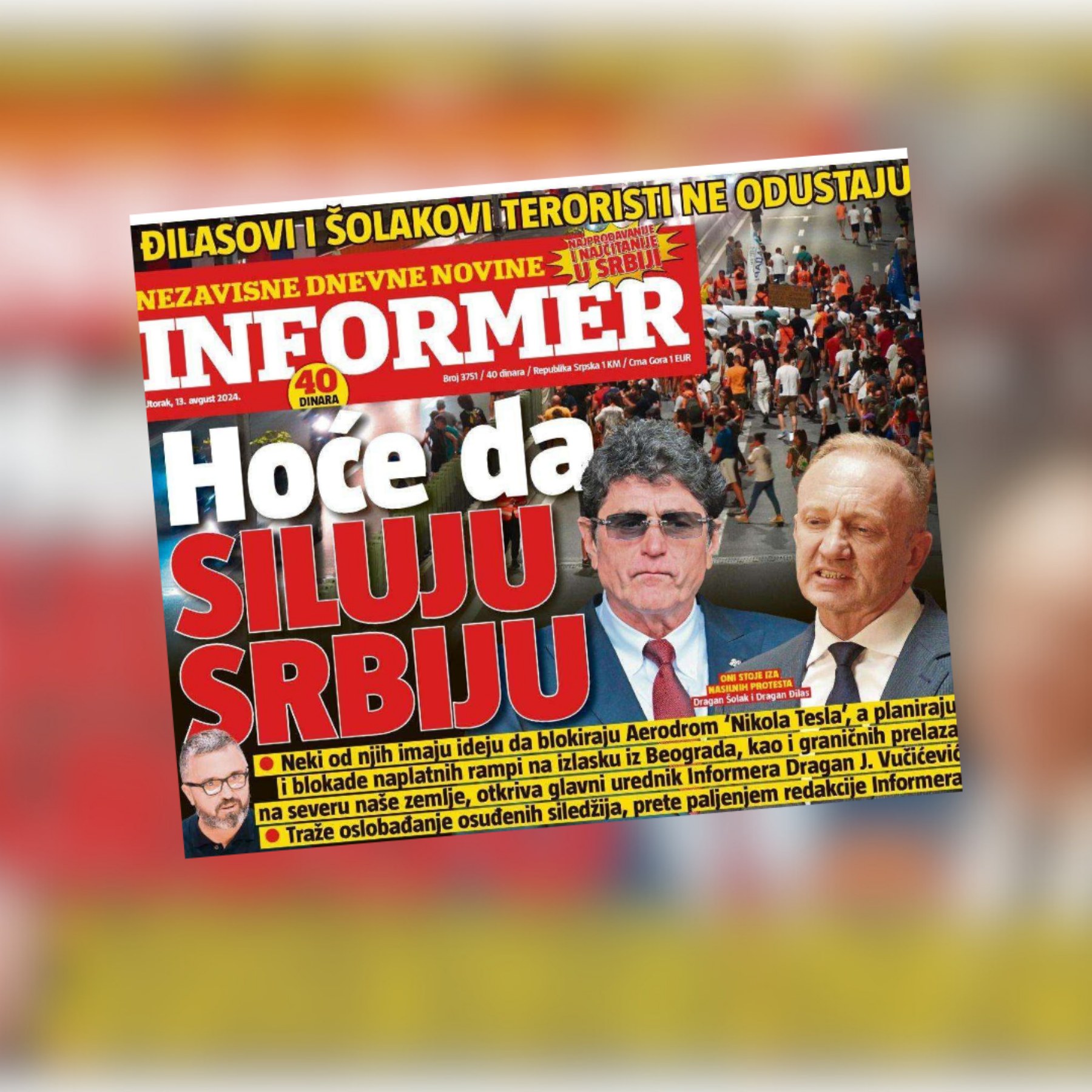 „Rušiteljska opozicija predvođena Draganom Đilasom i Draganom Šolakom ne odustaje od pravljenja haosa u Srbiji”, navodi Informer u naslovu nepotpisanog teksta. Ovaj tabloid tvrdi da Dragan Šolak „plaća za haos u Srbiji”, dok Dragana Đilasa optužuje da „hoće silom na vlast”. U tekstu se takođe koristi konstrukcija „Đilasovi i Šolakovi teroristi”.