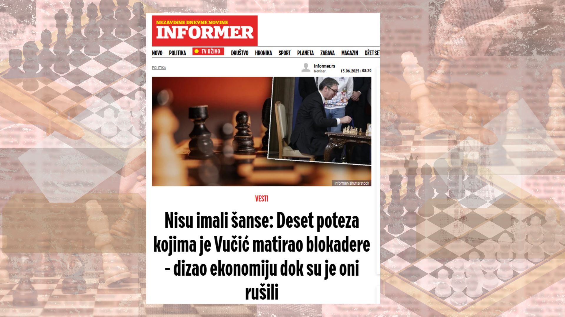 Sedam meseci nakon što su studenti započeli blokade fakulteta, a uoči najavljenog protesta na Vidovdan, provladin tabloid Informer objavljuje trijumfalistički tekst u kojem proglašava pobedu predsednika Aleksandra Vučića nad „blokaderima”. Tabloid piše o deset Vučićevih „poteza” kojima je navodno porazio studentski pokret. U tom narativu, predsednik je uspeo da spreči građanski rat, ispuni studentske zahteve, sačuva ekonomiju i ostane imun na spoljne pritiske – dok protesti, kako tvrde, protiču mirno i bez incidenata. U nastavku teksta, Raskrikavanje razotkriva ključne manipulacije Informerovog teksta.