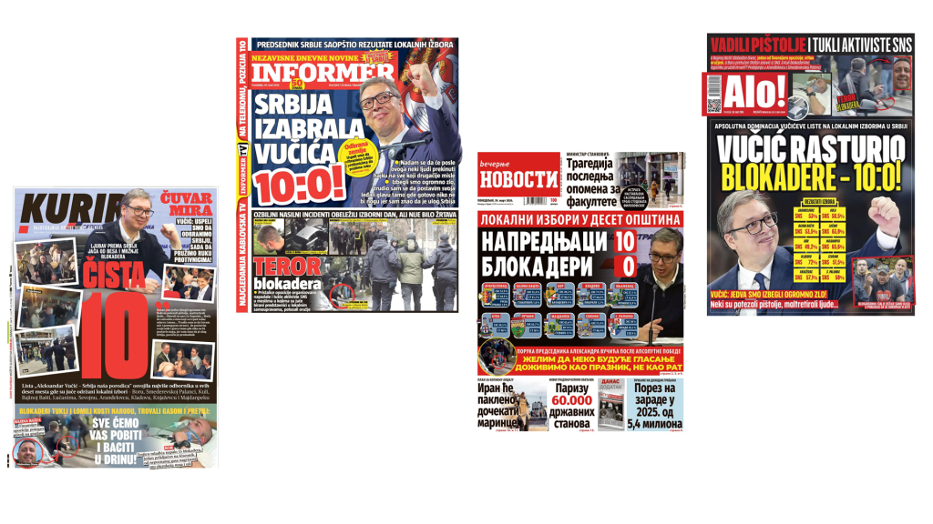 Tabloidi su, međutim, današnje naslovnice oblikovali sasvim drugačije i na njima prenosili gotovo identičnu propagandnu poruku – Srbija je izabrala Vučića, koji je čuvar mira i koji je „rasturio blokadere” 10:0.