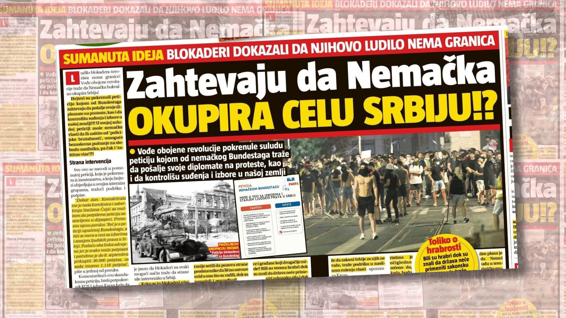 U pokušaju da odbrane vlast SNS-a i ocrne demonstrante i studente u blokadi, provladini tabloidi su se poslednjih devet meseci služili različitim manipulacijama. Poslednja u nizu, aktuelna ovih dana, je peticija koju je u junu pokrenula srpska dijaspora u Nemačkoj. Peticijom se od Bundestaga (nemački savezni parlament) traži da pošalje diplomate da posmatraju proteste.