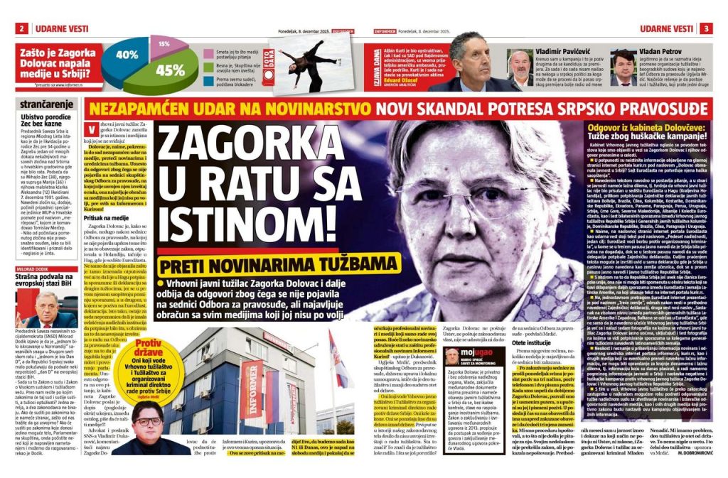 Informer je, tako, u svom današnjem štampanom izdanju objavio demanti tužilaštva, ali odmah pored tekst u kome ponavljaju već demantovane navode kao i sliku Zagorke Dolovac provučenu kroz „neprijateljski filter”.