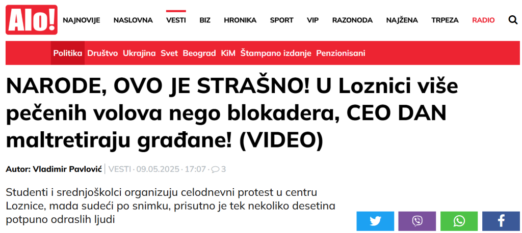 Nije jasno kojim se to „Srbima” obraća pozivima na ujedinjenje, ni da li i studente smatra „Srbima”. Čini se da su svi koji protestuju, za Alo ipak ona druga vrsta Srba, manje legitimna, koja širi mržnju pod dirigentskom palicom opozicionih lidera i opozicionih medija što „pumpaju lažne informacije”.