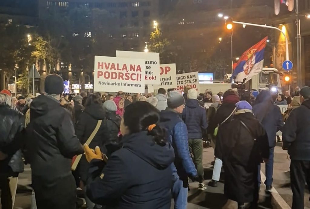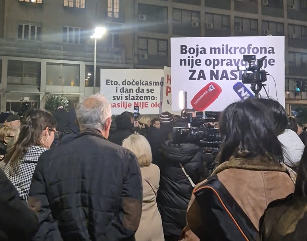Foto: Raskrikavanje / Zaposleni Informera pojavili su se sa transparentima na skupu podrške organizovanom nakon napada na ekipu N1