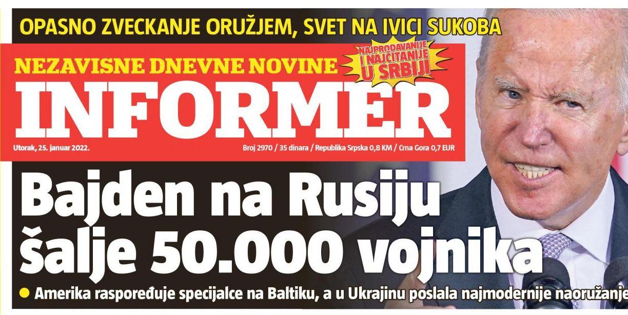 Informer nedvosmisleno navodi da će američki predsednik, Džo Bajden, koji „misli da je gospodar sveta” poslati čak 50.000 vojnika, borbene letelice i ratne brodove na ruske granice.
