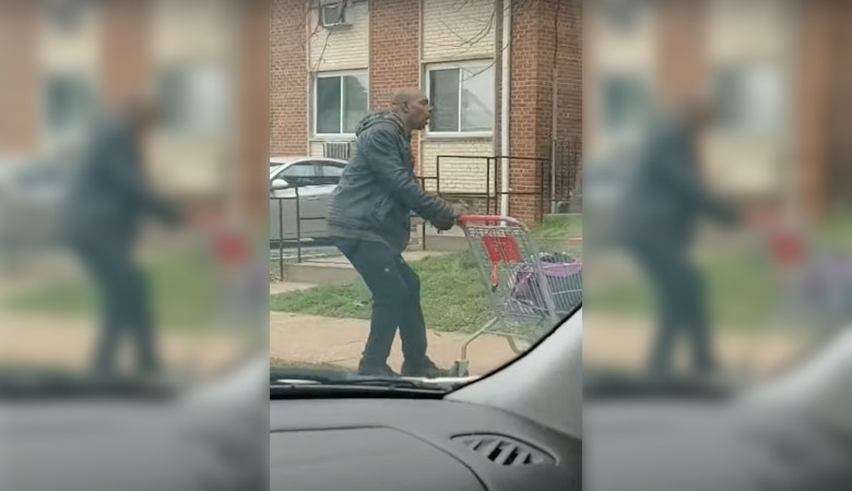 Video je snimljen iz automobila u pokretu – na trotoaru se nalazi čovek sa kolicima iz supermarketa koji stoji ukočen i kao „zamrznut“.