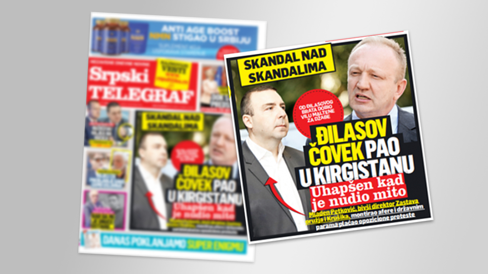 Tako je tabloid Srpski telegraf na naslovnoj strani objavio tekst „ĐILASOV DIREKTOR PAO U KIRGISTANU: Uhapšen kad je nudio MITO oficiru”. Tekst je objavljen i na portalu ovog tabloida i počinje rečima: „Neverovatan slučaj nastavka korupcionaške prakse”.