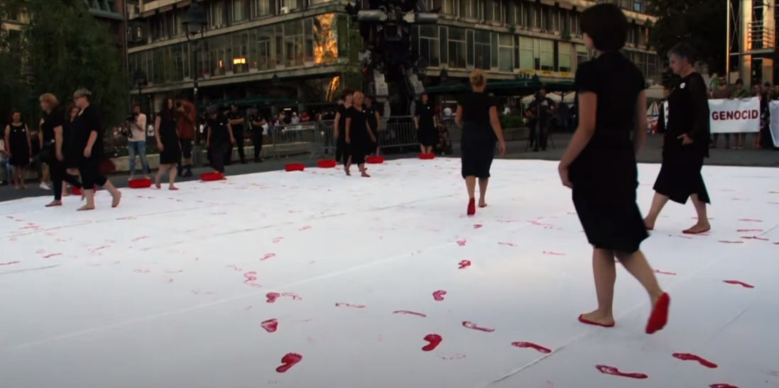 Naime, reč je o performansu iz jula 2015, u kojem su povodom obeležavanja 20 godina od genocida u Srebrenici, učestvovali aktivisti nekoliko organizacija, među kojima i „Žene u crnom” i „Dah teatar”, na Trgu republike u Beogradu.