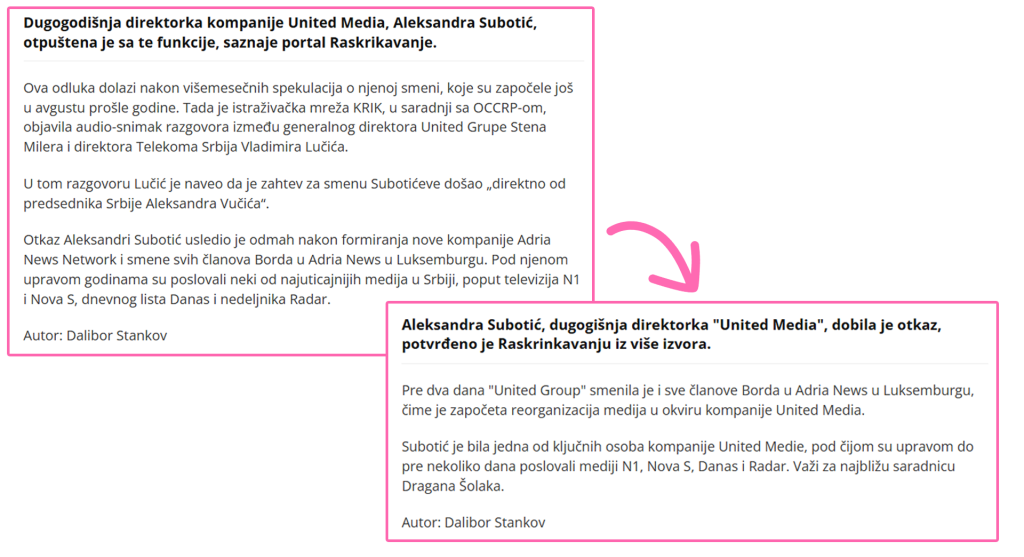Nakon što smo juče objavili da je dugogodišnja direktorka United Media-e Aleksandra Subotić otpuštena, našu vest preuzelo je na desetine portala. Među njima je, neuobičajeno, bio i Pink, koji je Raskrikavanje čak i naveo kao izvor. U njihovoj prvoj verziji teksta stajalo je da je smena Subotić usledila nakon razgovora generalnog direktora United Group-e Stena Milera i direktora Telekoma Srbija Vladimira Lučića, u kojem Lučić navodi da je zahtev za njenu smenu došao od predsednika Vučića. Međutim, samo nekoliko minuta nakon objave, ta informacija je uklonjena iz teksta na portalu Pink.