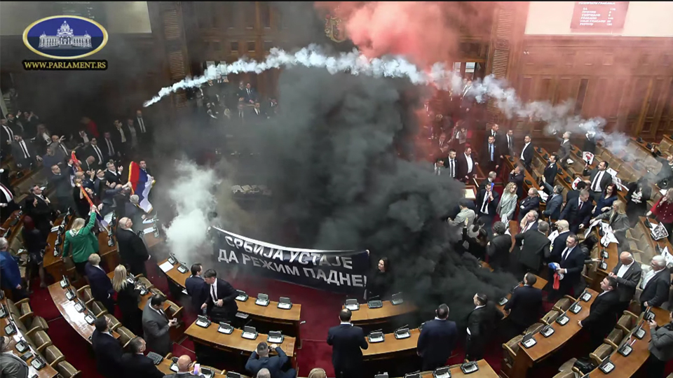 Došlo je do brojnih incidenata nakon što su članovi opozicije ubacili dimne bombe u salu, upalili baklje i razvili transparent sa natpisom „Srbija ustaje da režim padne”.