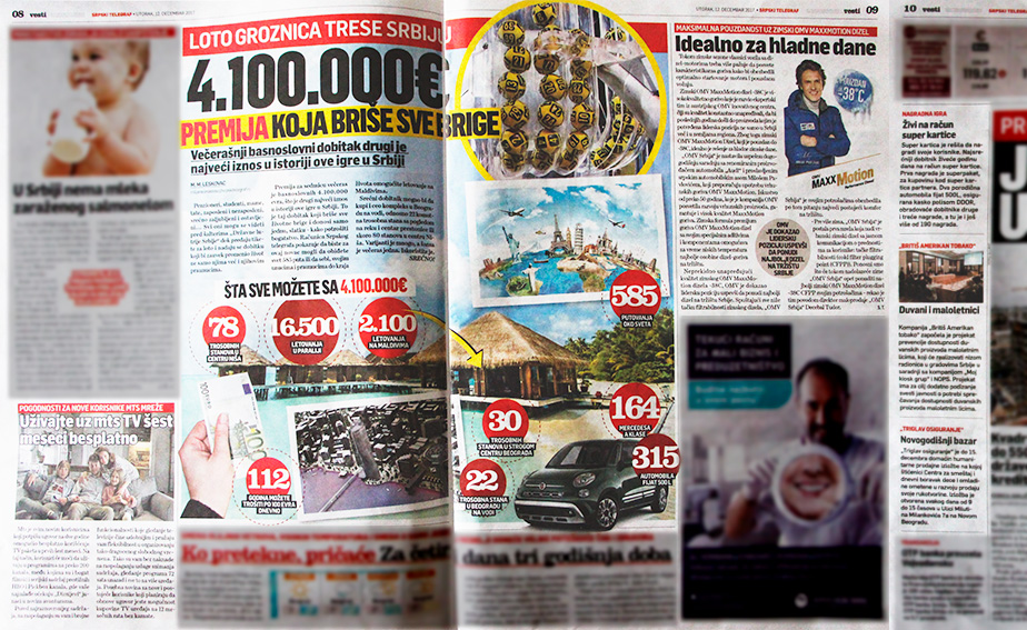 Najveći tekst bio je o „LOTO“ igrama na sreću Državne lutrije Srbije. To državno preduzeće je u odgovoru za Raskrikavanje negiralo da je taj konkretan tekst plaćen, ali da imaju saradnju sa ovim novinama.