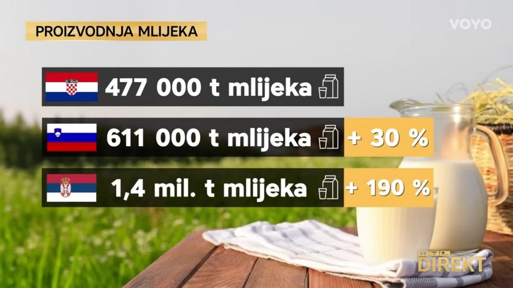 RTL u svom prilogu ukazuje da se broj krava u Hrvatskoj prepolovio, kao i da se sve više konzumira uvozno mleko, budući da domaća proizvodnja pokriva svega oko 40% potreba. Srbija se u prilogu pominje iključivo u kontekstu podatka da je proizvela 190% više mleka od Hrvatske.