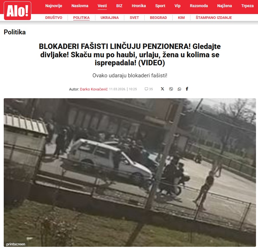 Alo dalje piše da su „blokaderi divljački skakali čoveku na automobil”, kao i da je napadnuti penzioner komšija „blokaderima” koji su ga napali.