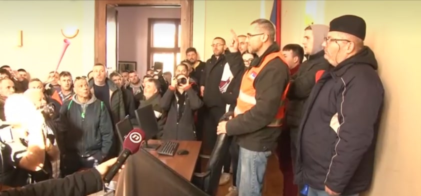 Foto: Skrinšot/N1 (demonstranati nakon što su prekinuli sednicu u opštini Bogatić, 7. februar 2025.)