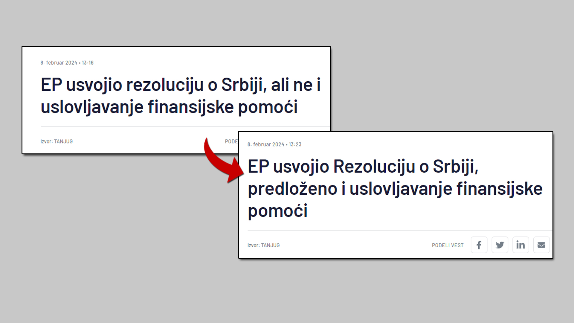 Međutim, upkos tome nekadašnja državna agencija Tanjug je prvobitno izvestila da je „EP usvojio rezoluciju o Srbiji, ali ne i uslovljavanje finansijske pomoći”. Svoj tekst su korigovali u roku od 10-ak minuta i ispravno ga naslovili sa „EP usvojio Rezoluciju o Srbiji, predloženo i uslovljavanje finansijske pomoći”. Portal K1 preneo je originalnu verziju teksta, sa pogrešnim naslovom i do pisanja ovog teksta ga nije ispravio.