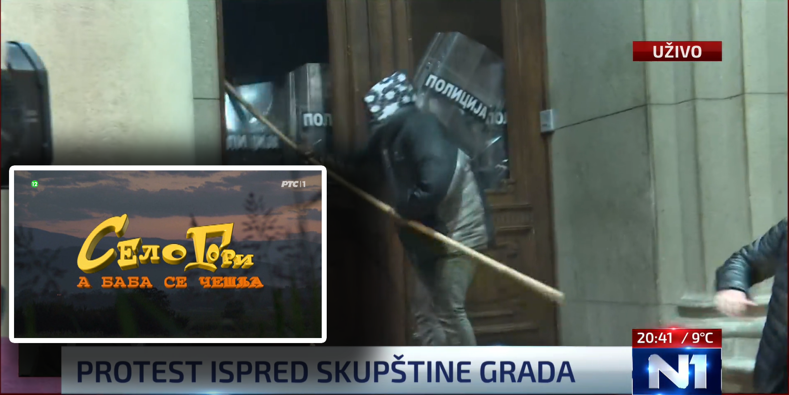 Potom je počela serija „Selo gori a baba se češlja“ nešto posle pola devet. U tim minutima je demonstrant motkom kroz polomljena vrata Skupštine udarao policiju, a policija izbacivala suzavac. Jedan od lidera opozicije, Aleksandar Jovanović Ćuta, davao je izjavu za N1 jedva držeći oči otvorenim.