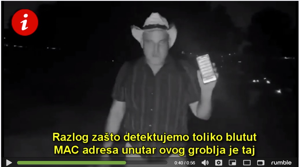 „Šta mislite kakve su ovo blutut adrese koje se očitavaju? Ja ću vam reći ali se fektčekeri neće složiti sa mnom: razlog što detektujemo toliko blutut adresa unutar ovog groblja je taj što ovde ima dosta (nanočipovanih) ljudi koji su ubijeni kovid-19 vakcinama i PCR testovima“.