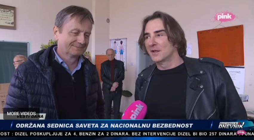 Foto: Skrinšot sa Jutjub kanala RTV Pink Official / Darko Glišić i Željko Mitrović prilikom posete osnovnoj školi u Markovici.