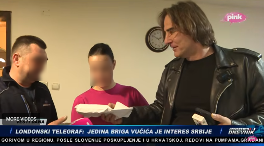 Foto: Skrinšot sa Jutjub kanala RTV Pink Official / Željko Mitrović daje novac jednoj od porodica tokom svog „humanitarnog karavana” (lica članova porodice smo zamaglili radi zaštite privatnosti).